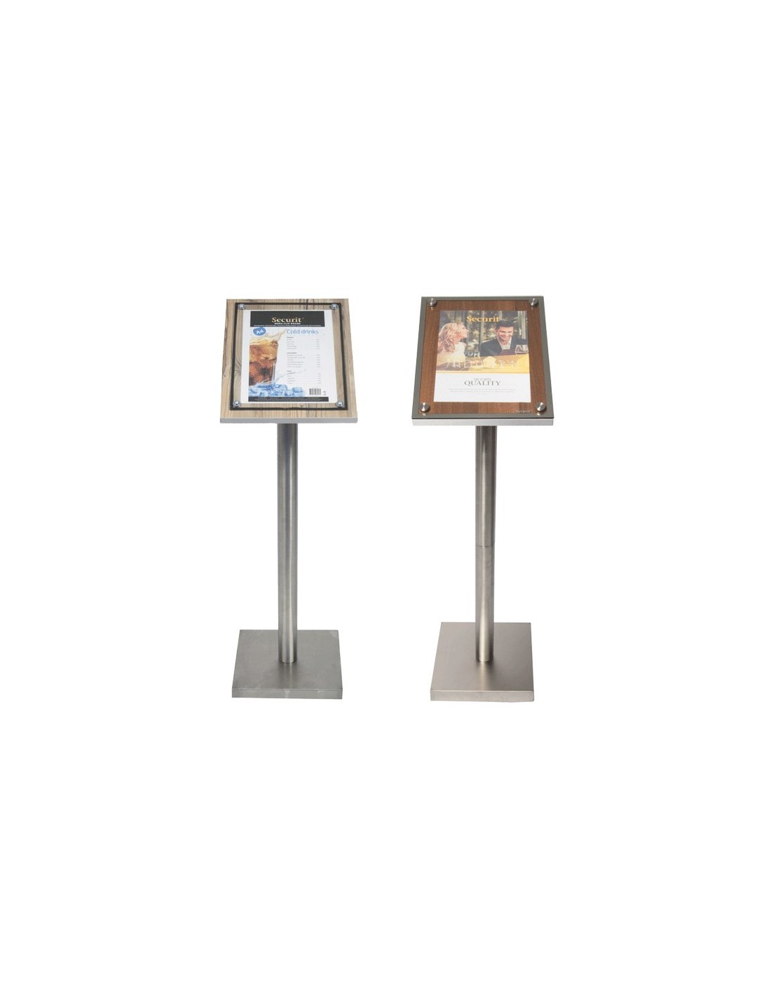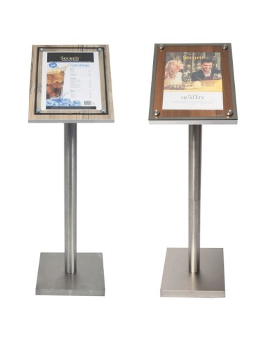 Portamenús con pie de acero para suelo.