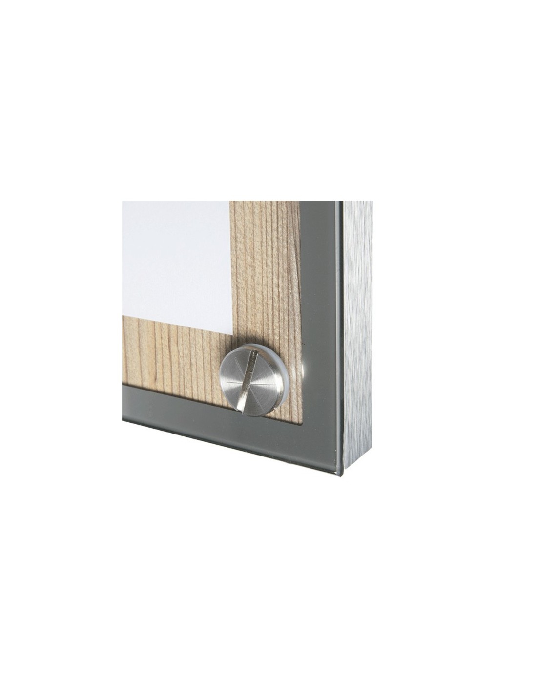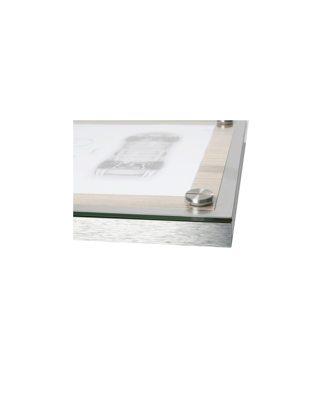 Expositor portamenús de diseño, fabricado en madera de alta calidad, con el borde de acero inoxidable y placa frontal de cristal sujeta con 4 elegantes embellecedores.